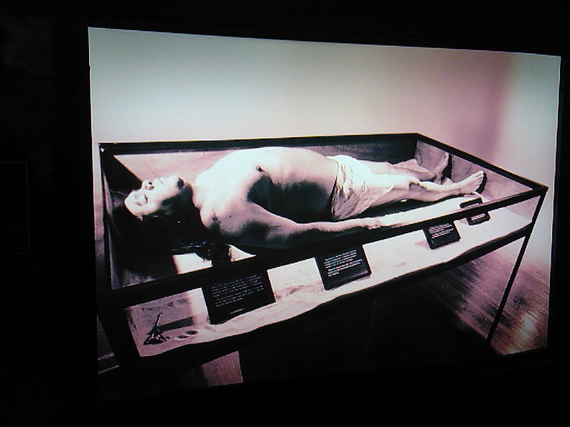 The artist James Luna (Luiseo) lay motionless in a 19th century museum display case. Labels commented on the scars on his body. Nearby cases contained Luna’s family photographs, Luiseo medicine objects, and other personal items, laid out like early anthropological displays of arrowheads, pottery shards and tools.