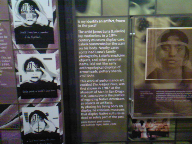 “This work of performance art, entitled The Artifact Piece, was first shown in 1987 at the Museum of Man in San Diego.? In it, Luna subverts the practice of regarding Native Americans as objects or artifacts.? By placing his living body on display, he criticises museums that display Native cultures as dead or solely part of the past.”